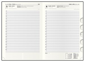 manažerský diář v novém provedení a zajímavých barvách, jemný materiál, oboustranná pěnová výplň desek, obšití v barvě potahu, magnetická přezka, poutko na propisku, 3 vnitřní kapsy, výseky, žlutý chamois papír, české a slovenské jmenné kalendárium, možnost v dalším roce výměny jen vniřní náplně, formát 14,3 x 20,5 cm