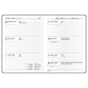 povrch diáře z matného nepoškrabatelného lamina se zlatou ražbou, rovný hřbet, zakulacené rohy, gumička v barvě diáře, , české a slovenské jmenné kalendárium, mezinárodní svátky, měsíční fáze, roční období, letní a zimní čas, místo na poznámky, formát 12 x 16,5 cm