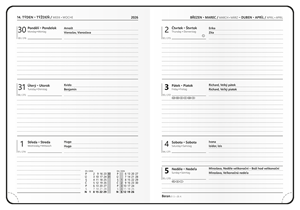 povrch diáře z matného nepoškrabatelného lamina se zlatou ražbou, rovný hřbet, zakulacené rohy, gumička v barvě diáře, , české a slovenské jmenné kalendárium, mezinárodní svátky, měsíční fáze, roční období, letní a zimní čas, místo na poznámky, formát 12 x 16,5 cm