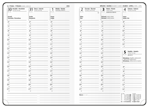 jemný materiál (imitace semiše), jednostranná výplň desek, ražba roku, rovný hřbet, zakulacené rohy, české a slovenské jmenné kalendárium, dny a měsíce v 5 jazycích (CZ, SK, ANG, D, R), mezinárodní svátky, měsíční fáze, roční období, letní a zimní čas, místo na poznámky, formát 14,3 x 20,5 cm
