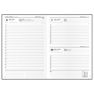 jemný hladký materiál, ražba motivu včetně ražby roku, rovný hřbet, , české a slovenské jmenné kalendárium, mezinárodní svátky, měsíční fáze, roční období, letní a zimní čas, místo na poznámky, formát 12 x 16,5 cm