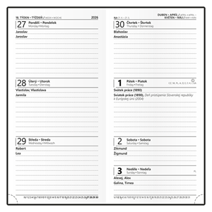 povrch diáře příjemný na dotek, zářivé barvy, moderní design, české a slovenské jmenné kalendárium, dny a měsíce v 5 jazycích (CZ, SK, ANG, D, R), mezinárodní svátky, měsíční fáze, roční období, letní a zimní čas, místo na poznámky, formát 7,5 x 15 cm