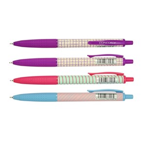 plastové kuličkové pero s originálním designem a gumovým úchopem pro pohodlné psaní a s stiskacím mechanismem, s jehlovým hrotem o šíři 0,6 mm a náplní, která se podobá gelu, zaručuje plynulé a lehké psaní, náhradní náplň Extra Fine, píše modře, dodáváno v mixu barev