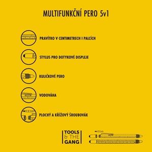 multifunkční kuličkové pero 5v1, kuličkové pero, pravítko v cm i palcích, vodováha, plochý a křížový šroubovák, dotykový stylus pro tablety a smartphony, modrá náplň, inkoust na olejové bázi, černá barva, stiskací mechanika, balení v blistru, rozměry 155 × Ø 13 mm