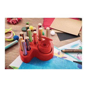 multifunkční pastelka, vodovka a voskovka v jednom, ideální pro dětské ruce díky své tloušťce, nelámavá tuha XXL o průměru 10 mm, kreslí na různé povrchy: dřevo, karton, sklo, kůže, plast, kov a další hladké povrchy, vysoká krycí schopnost a intenzita barev i na tmavém papíře, vyrobena 100% ze dřeva certifikovaného PEFC, bezpečnoství ořezávátko, v praktickém stojánku na stůl, který obsahuje: 10 barev woody , 2 barvy woody pastel , 3 barvy woody duo