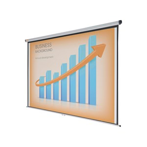 Zářivý matně bílý povrch plátna zaručuje ostrý, podrobný obraz, který zřetelně uvidí všichni diváci. Lze je snadno zasunout do pouzdra, aby bylo chráněno před poškozením, nebo uloženo, když není používáno. Doplňkové držáky umožňují instalovat plátno před popisovací tabuli nebo je sklonit směrem k divákům. 2400 × 1600 mm.