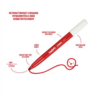 fixy Jumbo se silným hrotem ø 6 mm, maxi osmihranný tvar těla pro snadné držení, odolný hrot, dermatologicky testované, bez lepku, snadno omyvatelné a pratelné, inkoust s dlouhou životností, jasné a zářivé barvy, odvětrávané víčko, vyrobeno v Itálii, obsah balení 50 ks, nevhodné pro děti do 3 let