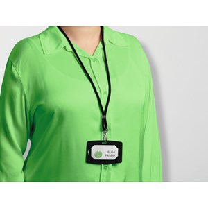 textilní šňůrka na krk z recyklovaného PET, s bezpečnostním uzávěrem, který se otevře při silném tahovém zatížení, kulatá tkaná s karabinou, ideální pro jmenovky nebo pouzdra na ID karty, které mají výřez na klip, délka šňůrky: 46 cm, minimální odběr 1 balení á 10 ks