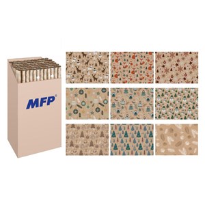 Vánoční balicí kraftový papír v mixu 8 motivů, ideální pro krásné zabalení vánočních dárků, vhodný k doplnění o stužky a jmenovky, gramáž 70 g, velikost archu 100 × 70 cm, balení 2 ks.