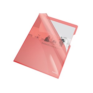 Desky na dokumenty typu L s hladkým povrchem, vyrobené z tuhé kvalitní PVC fólie pro reprezentativní vzhled, přístup z horní i boční strany, s vykrojením pro snadnou manipulaci, síla 150 mic, červené provedení, balení 25 ks.