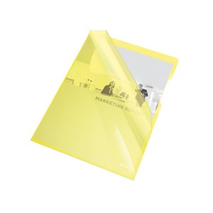 Desky na dokumenty typu L s hladkým povrchem, vyrobené z tuhé kvalitní PVC fólie pro reprezentativní vzhled, přístup z horní i boční strany, s vykrojením pro snadnou manipulaci, síla 150 mic, žluté provedení, balení 25 ks.